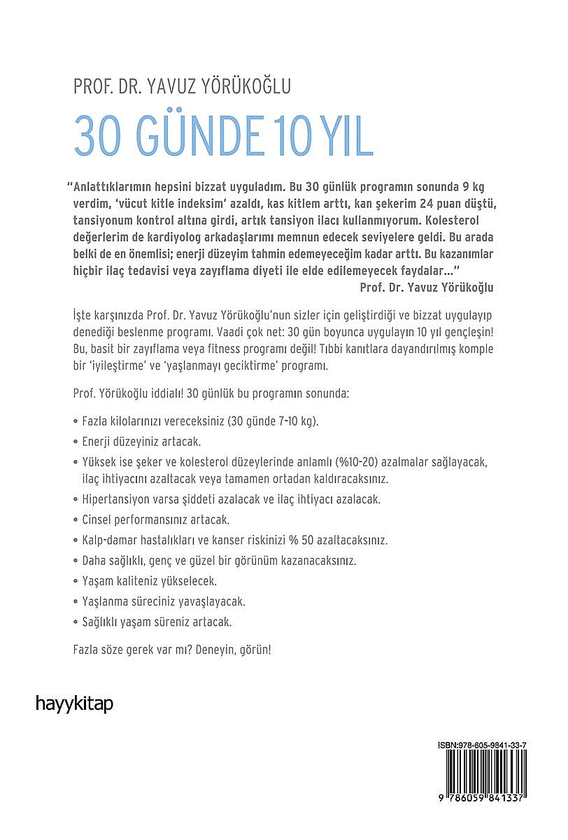 “Anlattıklarımın hepsini bizzat uyguladım. Bu 30 günlük programın sonunda 9 kg verdim, ‘vücut kitle indeksim’ azaldı, kas kitlem arttı, kan şekerim 24 puan düştü, tansiyonum kontrol altına girdi, artık tansiyon ilacı kullanmıyorum. Kolesterol değerlerim de kardiyolog arkadaşlarımı memnun edecek seviyelere geldi. Bu arada belki de en önemlisi; enerji düzeyim tahmin edemeyeceğim kadar arttı. Bu kazanımlar hiçbir ilaç tedavisi veya zayıflama diyeti ile elde edilemeyecek faydalar…”