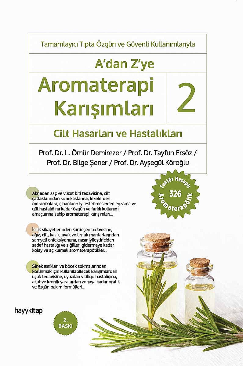 Aynı zamanda Türkiye’de çok satan, Tamamlayıcı Tıp Onayı ve Güvenli Kullanım Önerileriyle bir ilk olan‘A’dan Z’ye Tıbbi Bitkiler’ve‘A’dan Z’ye Tıbbi Yağlar ve Aromatik Sular’kitaplarının yazarlarından da olan dört profesör, 6 ciltten oluşan‘A’dan Z’ye Aromaterapi Karışımları’serisinin bu ikinci kitabında; tıbbi etkinlikleri bilimsel olarak kanıtlanmış uçucu yağlardan ve diğer doğal ürünlerden hareketle hazırlanan; akne, çıban, çatlak, leke, kızarıklık, morluk, egzama, gül hastalığı, isilik, kaşıntı, mantar, nasır, sedef, siğil, sinek ve böcek kovucu, sinek ve böcek ısırıkları, uçuk, uyuz, vitiligo, yanık, yara, yatak yarası ve zona gibi ‘cilt hasarları ve hastalıkları’ için kullanılabilecek 326 özgün karışımı okurlara sunmaktadır.