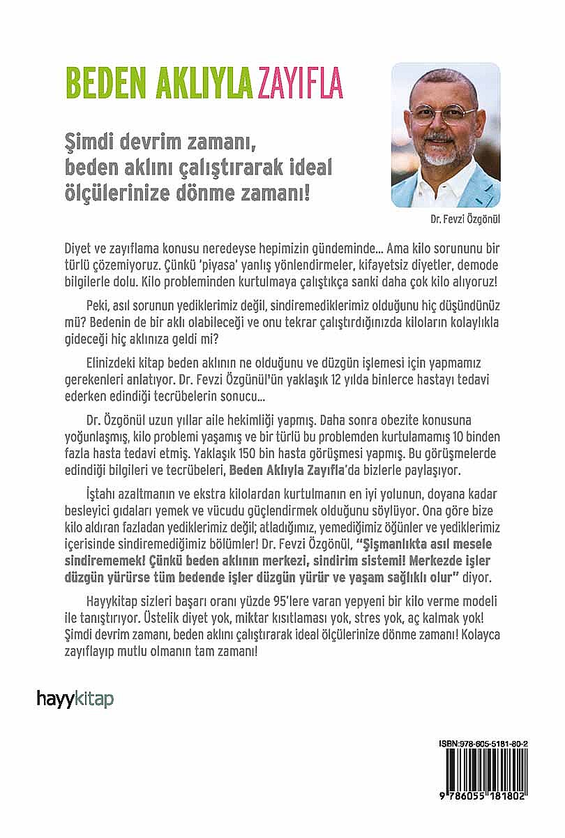 Hayykitap sizleri başarı oranı yüzde 95’lere varan yepyeni bir kilo verme modeli ile tanıştırıyor. Üstelik diyet yok, miktar kısıtlaması yok, stres yok, aç kalmak yok! Şimdi devrim zamanı, beden aklını çalıştırarak ideal ölçülerinize dönme zamanı! Kolayca zayıflayıp mutlu olmanın tam zamanı!