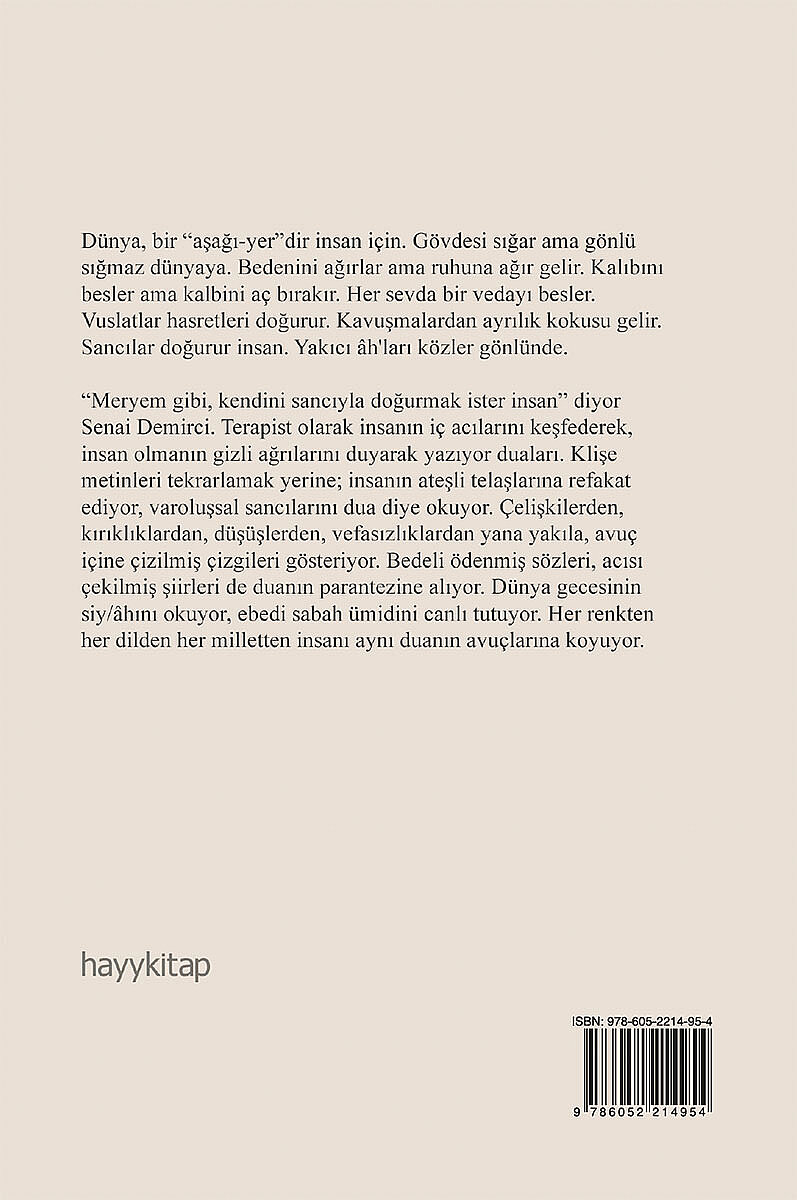 “Meryem gibi, kendini sancıyla doğurmak ister insan” diyor Senai Demirci. Terapist olarak insanın iç acılarını keşfederek, insan olmanın gizli ağrılarını duyarak yazıyor duaları. Klişe metinleri tekrarlamak yerine; insanın ateşli telaşlarına refakat ediyor, varoluşsal sancılarını dua diye okuyor. Çelişkilerden, kırıklıklardan, düşüşlerden, vefasızlıklardan yana yakıla, avuç içine çizilmiş çizgileri gösteriyor. Bedeli ödenmiş sözleri, acısı çekilmiş şiirleri de duanın parantezine alıyor. Dünya gecesinin siy/âhını okuyor, ebedi sabah ümidini canlı tutuyor. Her renkten her dilden her milletten insanı aynı duanın avuçlarına koyuyor.