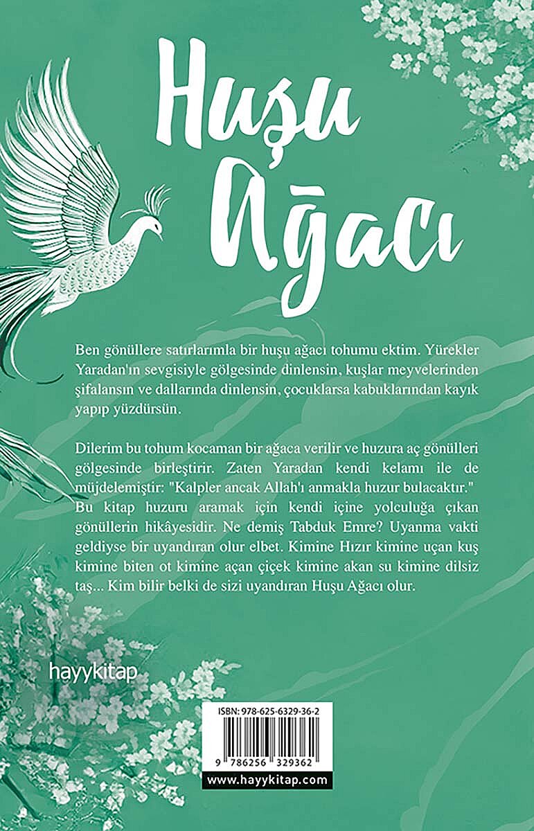 Ben gönüllere satırlarımla bir huşu ağacı tohumu ektim. Yürekler Yaradan'ın sevgisiyle gölgesinde dinlensin, kuşlar meyvelerinden şifalansın ve dallarında dinlensin, çocuklarsa kabuklarından kayık yapıp yüzdürsün. Dilerim bu tohum kocaman bir ağaca verilir ve huzura aç gönülleri gölgesinde birleştirir. Zaten Yaradan kendi kelamı ile de müjdelemiştir: "Kalpler ancak Allah'ı anmakla huzur bulacaktır." Bu kitap huzuru aramak için kendi içine yolculuğa çıkan gönüllerin hikâyesidir. Ne demiş Tabduk Emre? Uyanma vakti geldiyse bir uyandıran olur elbet. Kimine Hızır kimine uçan kuş kimine biten ot kimine açan çiçek kimine akan su kimine dilsiz taş... Kim bilir belki de sizi uyandıran Huşu Ağacı olur.