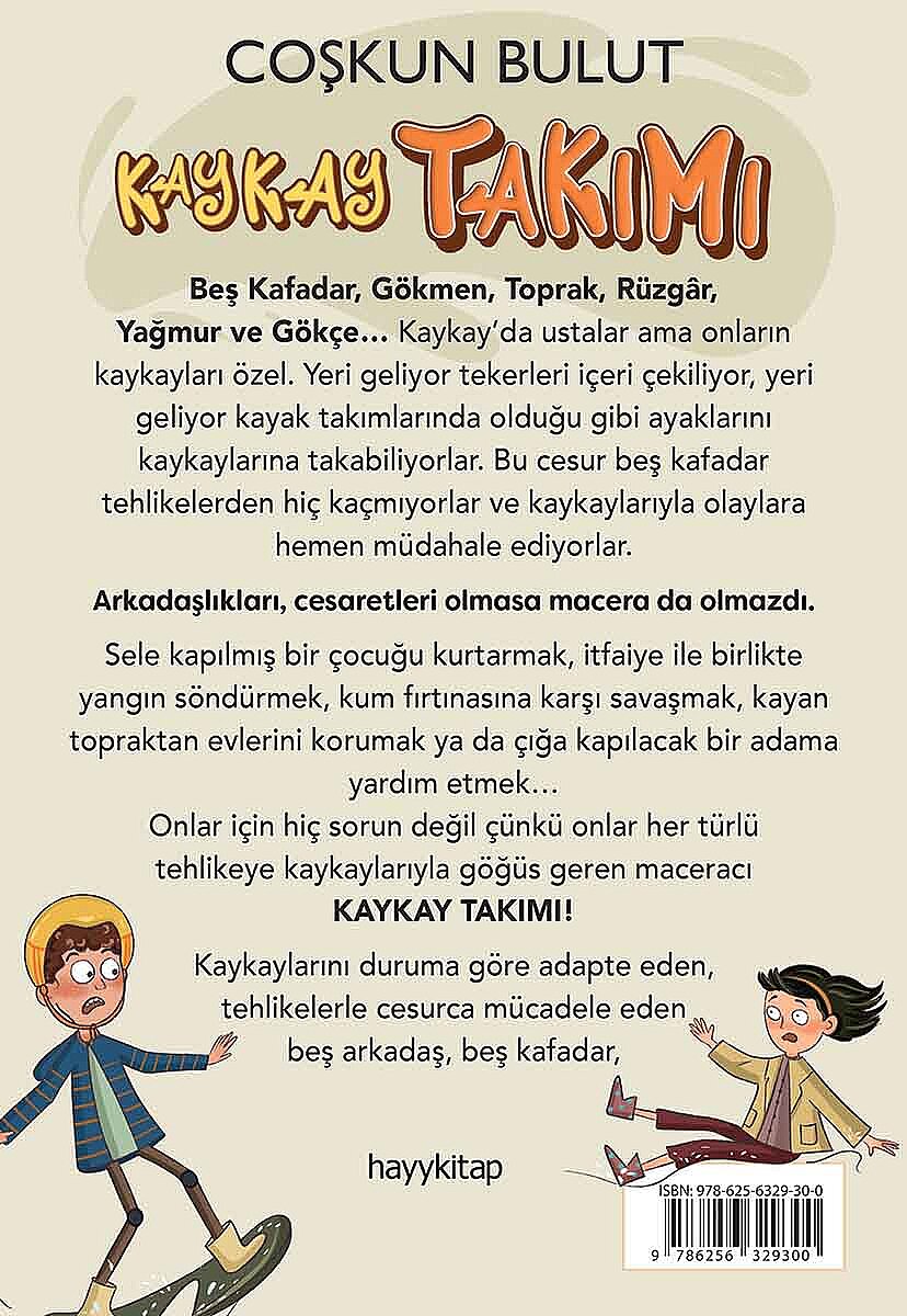 Beş kafadar, Gökmen, Toprak, Rüzgâr, Yağmur ve Gökçe… Kaykay’da ustalar ama onların kaykayları özel. Yeri geliyor tekerleri içeri çekiliyor, yeri geliyor kayak takımında olduğu gibi ayaklarını kaykaylarına takabiliyorlar. Bu cesur beş kafadar tehlikelerden hiç kaçmıyorlar ve kaykaylarıyla olaylara hemen müdahale ediyorlar. Arkadaşlıkları, cesaretleri olmasa macera da olmazdı. Sele kapılmış bir çocuğu kurtarmak, itfaiye ile birlikte yangın söndürmek, kum fırtınasına karşı savaşmak, kayan topraktan evlerini korumak ya da çığa kapılacak bir adama yardım etmek… Onlar için hiç sorun değil çünkü onlar her türlü tehlikeye kaykaylarıyla göğüs geren maceracı KAYKAY TAKIMI! Kaykaylarını duruma göre adapte eden, tehlikelerle cesurca mücadele eden beş arkadaş, beş kafadar, KAYKAY TAKIMI!